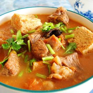 原料:牛肉、西红柿、冻豆腐、香菜末、葱、姜、八角、丁香、五香粉、白胡椒粉、酱油、美极鲜、盐、花生油、白砂糖、白酒。