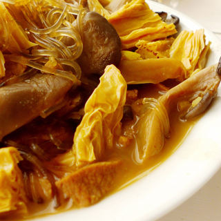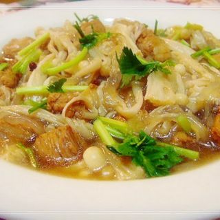 原料:平菇、腐竹、红薯粉条、葱姜碎、花椒、生抽、蚝油、盐、鸡精。