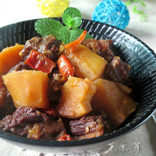 原料:牛腩、红薯、干辣椒、花椒、八角、桂皮、大葱、姜、蒜、料酒、老抽、柱候酱、糖、盐、鸡精。