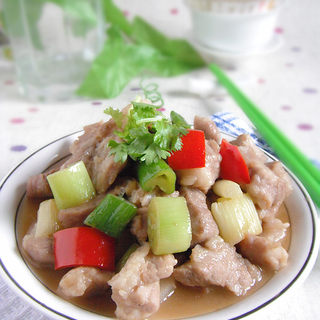 原料:五花肉、大葱、青红椒、香菜、姜片、食盐、料酒、生抽、白糖、水淀粉。