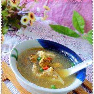 原料:月牙骨头、干松茸、葱、姜、枸杞、小香葱、盐、胡椒粉。