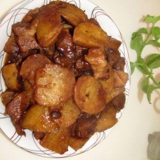 原料:后腿肉、土豆、花椒、葱、姜、豆豉、老抽、味精、盐、花生油。