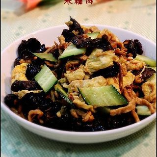 原料:猪肉丝、鸡蛋、黑木耳、黄花菜、黄瓜片。