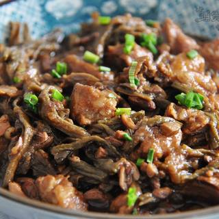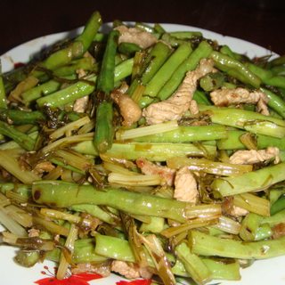 原料:肉丝、咸菜、豆角、油、盐、生抽、料酒、鸡精。