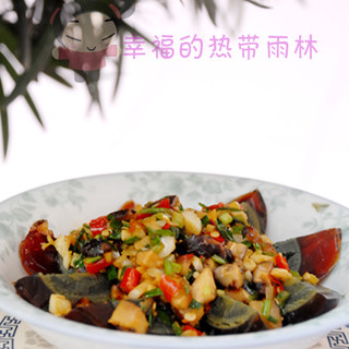 原料:皮蛋、香菇、食用油、剁椒、蒜、葱、生抽、胡椒粉。