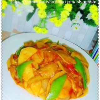 原料:猪里脊、辣椒、番茄酱、白糖、淀粉、调味料。