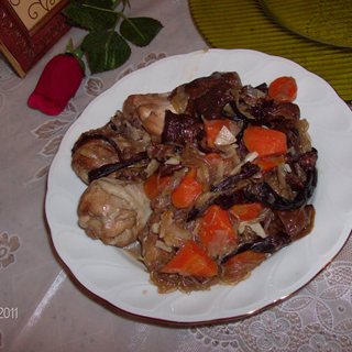 原料:鸡腿、榛蘑、油、姜粉、葱、蒜、盐、八角、生抽、红酒、糖、花椒。