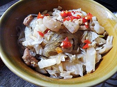原料:大白菜、黑木耳、胡萝卜、粉条、油、葱花、生抽、蒜末、盐、辣椒酱、味精。