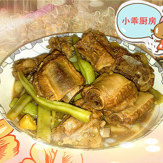 原料:豆角、颈骨、粉条、葱、姜、盐、糖、醋、花椒、八角、生抽、老抽、味精。