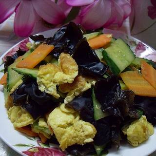 原料:黄瓜、木耳、胡萝卜、鸡蛋、葱、生抽、花椒粉、盐、鸡精。