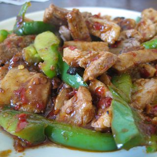 原料:姜片、蒜、五花肉、青椒、八角、橄榄油、豆瓣酱。