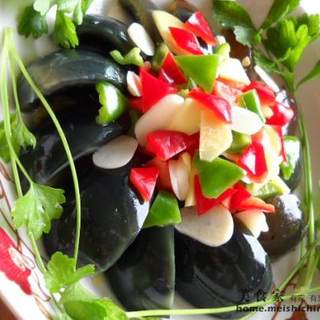 原料:松花蛋、青椒、红椒、蒜、姜、白醋、香油。
