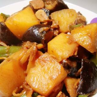 原料:土豆、茄子、尖椒、猪肉、葱姜蒜、葵花籽油、生抽、老抽、料酒、甜面酱、糖、盐、鸡精、凉水。