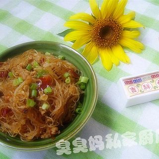 原料:豌豆粉丝、肉末、郫县豆瓣、老抽、花椒粉、姜、蒜末、葱花、高汤、郫县豆瓣、老抽、花椒粉、姜。