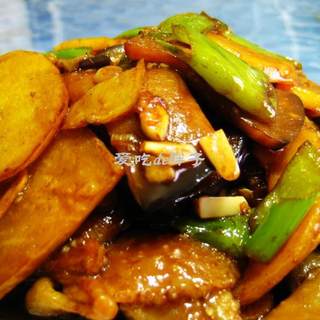 原料:圆茄子、土豆、青椒、葱姜蒜、酱油、美极鲜、糖、五香粉、盐。