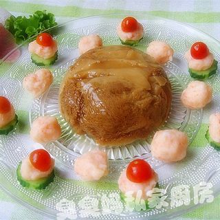 原料:猴头菇、鲜虾、黄瓜段、樱桃番茄、鸡汤、盐、胡椒粉、鲍鱼汁、葱、姜、淀粉。