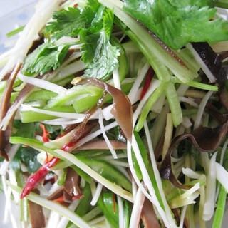 原料:香菜、大葱、木耳、茶干、青椒、大蒜、生姜、干红椒。