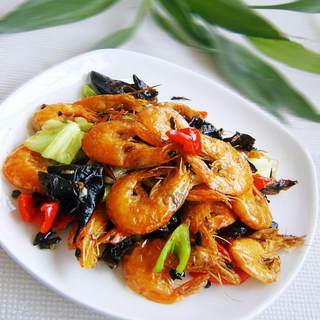 原料:北极虾、木耳、圆白菜、青红椒、干辣椒、花椒、淀粉、盐、白糖、蒜、蚝油。