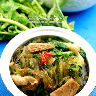 原料:苔菜、粉条、红椒、蒜、姜、葱、五花肉、盐、生抽。