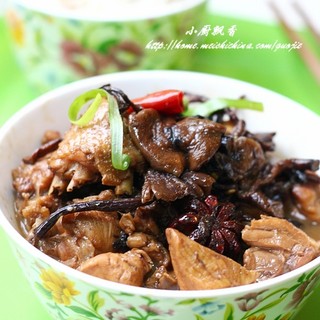 原料:小公鸡、榛蘑、葱段、姜片、干红辣椒、八角、冰糖、料酒、生抽、盐。