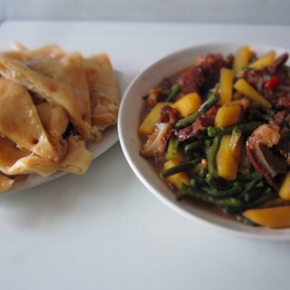 原料:月牙骨、面粉、土豆、豆角、葱、姜、干辣椒、精盐、味精、料酒、酱油。