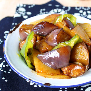 原料:长条茄子、土豆、青椒、蒜瓣、酱油、生抽、清水、淀粉、糖、盐。