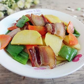 原料:土豆、腊肉、胡萝卜、青椒、鸡粉、生抽、盐。