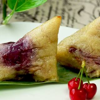 原料:白糯米、黑糯米、红枣、粽叶子、蓝莓味梅子干、芒果干、葡萄干。