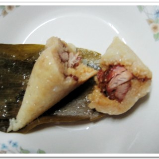 原料:糯米、肉、梅干菜、粽叶、油、棕树叶、稻草灰、盐。
