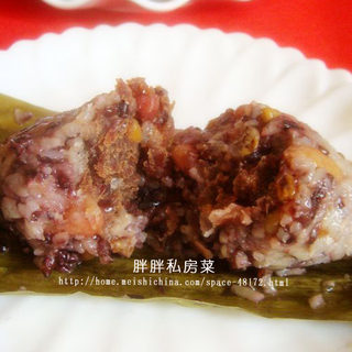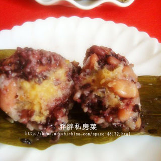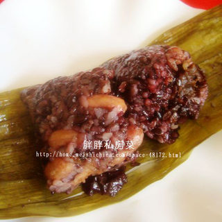 原料:黑米、糯米、红小豆、花豇豆、绿豆、花生米、莲蓉、冰糖、粽叶、水。