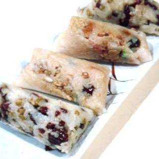 原料:熟粽子、白糖、蜂蜜、葡萄干、熟芝麻。