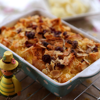 原料:土司、蔓越莓干、葡萄干、杏仁片、牛奶、淡奶、砂糖、鸡蛋、黄油。