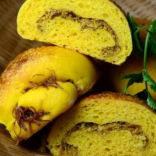 原料:高筋粉、南瓜泥、牛奶、黄油、酵母粉、盐、糖、牛肉松、蛋液。