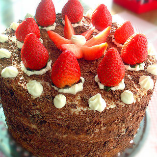 原料:8寸戚风蛋糕、淡奶油、草莓、香蕉、巧克力屑、白糖。