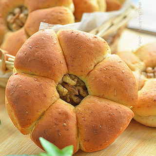 原料:金像高筋面粉、穗城全麦粉、即发干酵母、白糖、盐、奶粉、水、黄油、核桃仁、黄油。