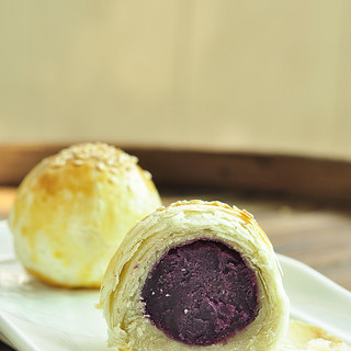 原料:面粉、猪油、紫薯、黄油、白糖、澄粉、蛋黄、白芝麻、糖、盐。