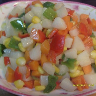 原料:山药、青椒、胡萝卜、甜玉米、红椒、盐、鸡精。