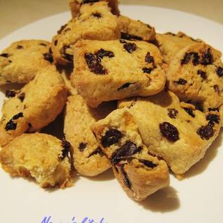 原料:低筋面粉、黄油、全蛋液、葡萄干、糖粉。