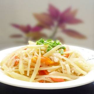 原料:土豆 、酸萝卜 、香葱、蒜瓣、彩椒 、食用油、盐。