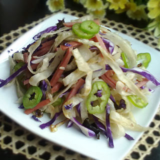 原料:春饼、紫甘蓝、火腿、青椒、木耳、葱花、油、盐、花椒、鸡粉。