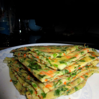 原料:菠菜、胡萝卜、面粉、鸡蛋、盐、鸡精、食用油。