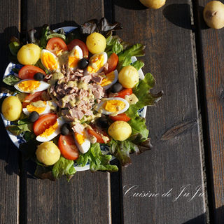 原料:生菜叶、番茄、鸡蛋、金枪鱼、黑橄榄、土豆、第戎黄芥末、醋、橄榄油、盐、胡椒。