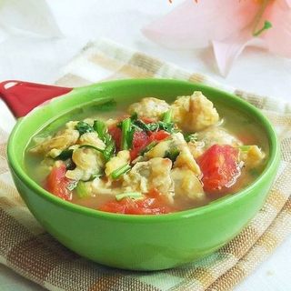 原料:白蛤肉、西红柿、鸡蛋、香菜、盐、芝麻油、胡椒粉。