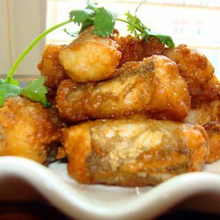 原料:豆腐鱼、家乐香炸粉、香菜。