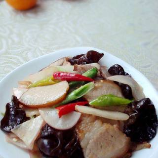 原料:红萝卜、黑木耳、瘦肉、红辣椒、植物油、盐、味极鲜、鸡精、姜、蒜苗。