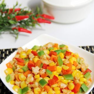 原料:虾仁、玉米、胡萝卜、青椒、红椒、蒜头、食用油、盐、生抽、胡椒粉、料酒。
