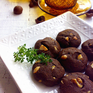 原料:低筋粉、有机红糖、蛋、巧克力粉、黄油、泡打粉、盐、夏威夷果仁、核桃仁。
