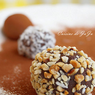 原料:黑巧(可可成分70%)、奶油、黄油、可可粉、杏仁碎或椰丝、香草精。