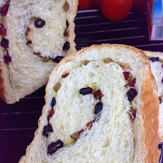 原料:高粉、牛奶、蛋、酵母、盐、糖、黄油、蔓越莓干、绿葡萄干、黑加仑子干、绿茶粉。