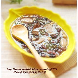 原料:红豆、绿豆、黑豆、黄豆、白雪豆、陈皮、冰糖。